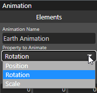 Adding a new animation can be done by pressing the "+" button. Doing so will replace the Properties bar with the Animation bar, where you can: