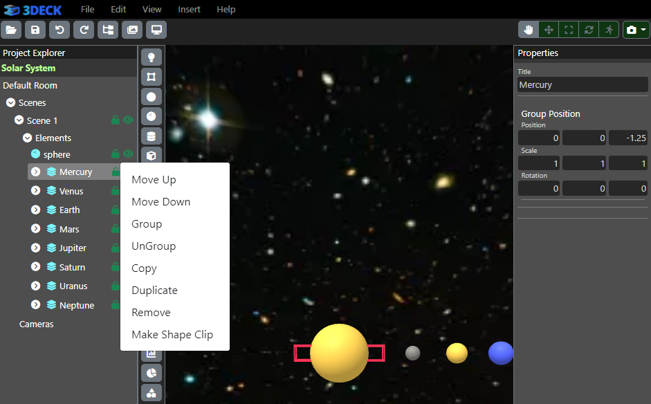 Once you've created an element, you can right-click the particular element in the Project Explorer to open up a menu of options relevant to the tree of scene elements.