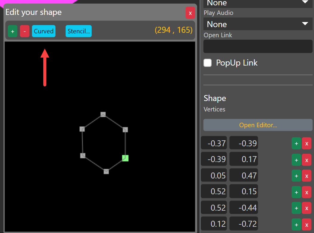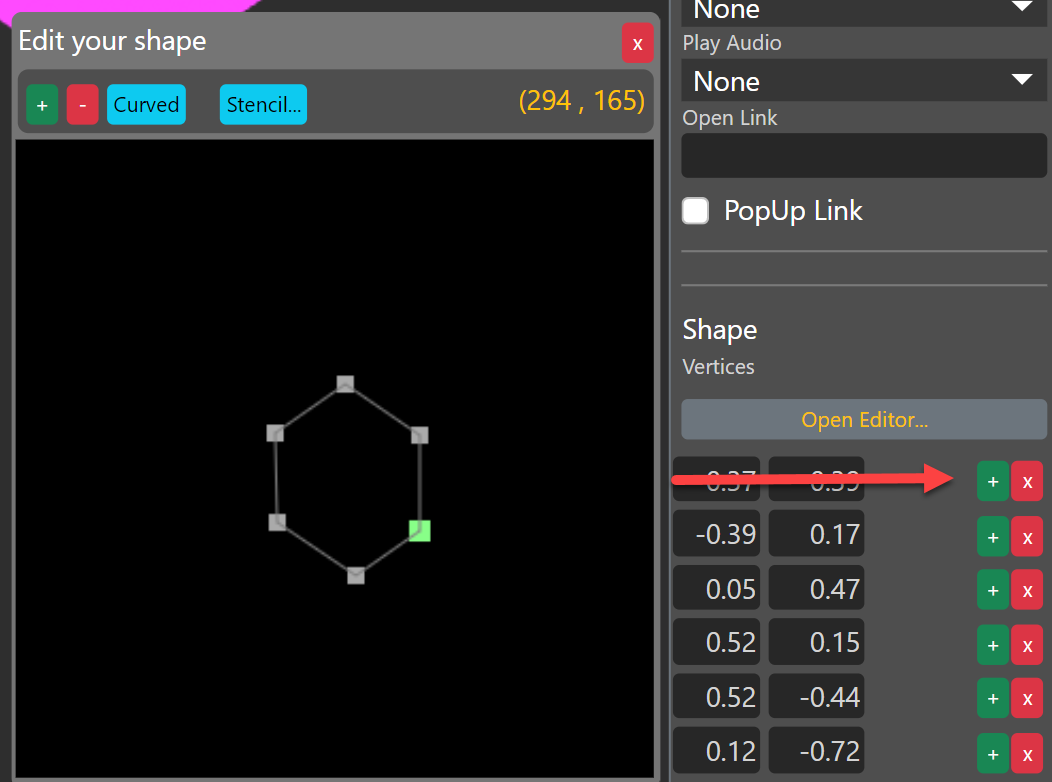 You can add or delete points from both the editor and the Properties panel. The location of a point in relation to other points will be determined from which point you click the addition. For instance, clicking the third "+" in the Properties panel will create a point in the fourth place. Meanwhile, clicking the "+" in the editor will add a new point to the right of the selected point relative to the top of the shape.