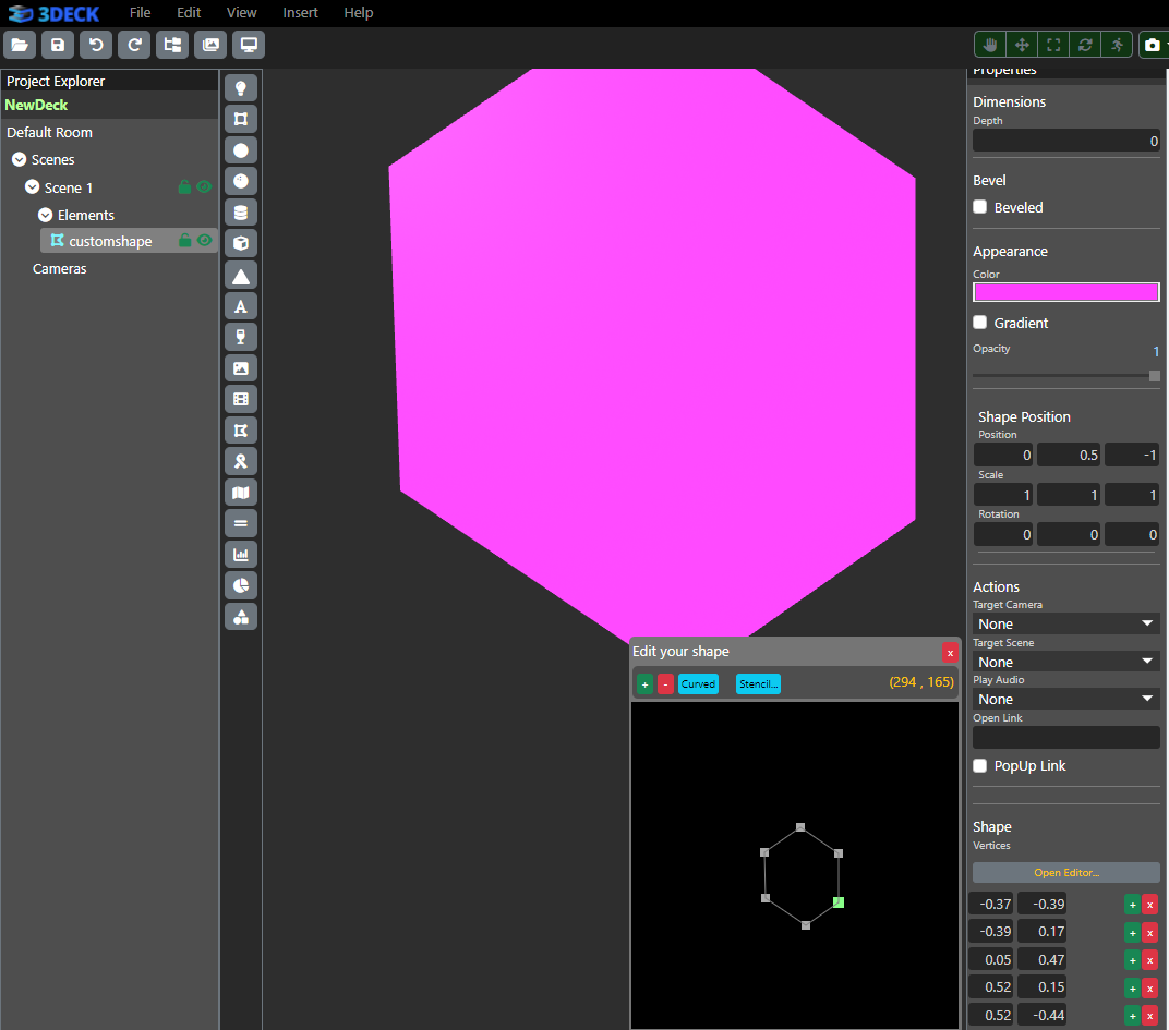Custom shapes work by editing the placement of different points. You can use the editor at the bottom of the Properties panel to drag each point and fashion the shape as you please. Alternatively, you can edit the points by hard-coding in X and Y values in the Properties panel.