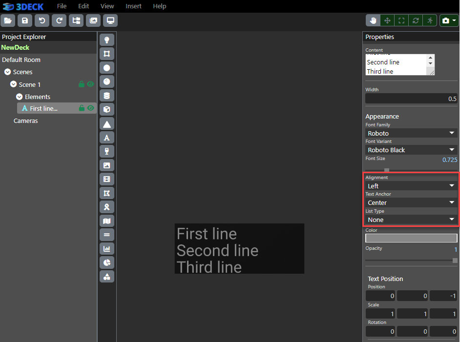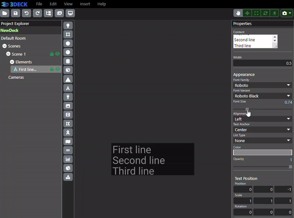 A textbox element has some features in the Properties panel that make it unique from other objects properties. One such feature is the content. This is where you can edit the text that will display in the content window. The font of the text can be edited below "Appearance", using the font's drop down menu. Other unique properties include Text Anchor and Alignment, the former of which decides where the text box is positioned relative to the point, whereas the latter decides how to align the text within the box.
