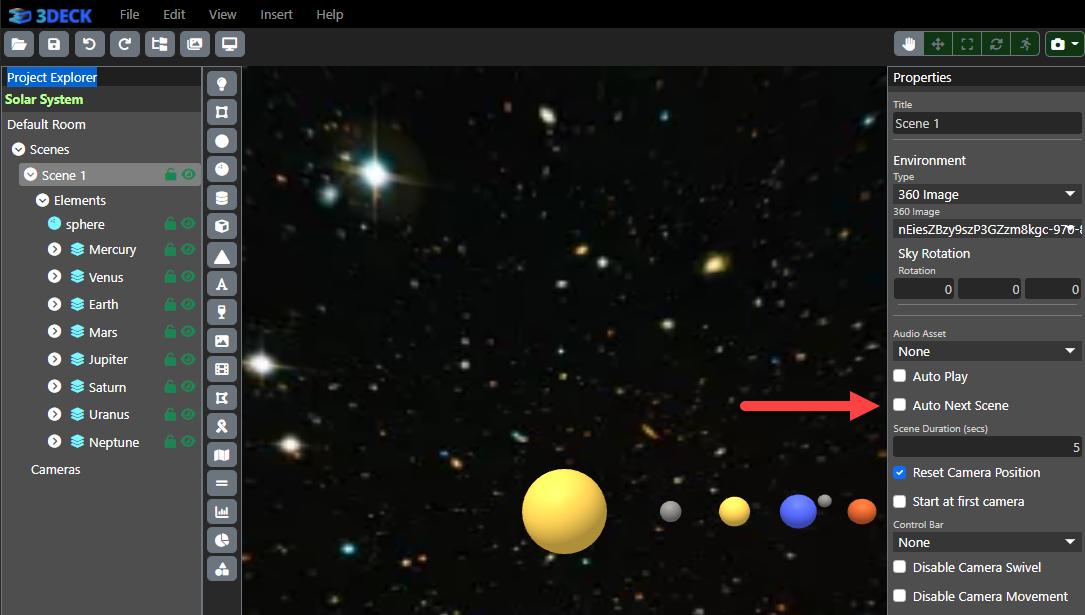 - You can autoplay scenes on a timer. You can set this from the Properties panel, by checking the "Auto Next Scene" box and typing in the duration in seconds. The time set is relative to the beginning of each scene and NOT relative to the beginning of previewing the deck.