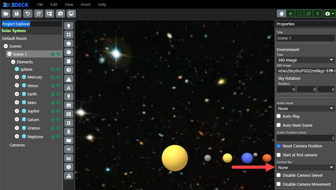 - You can set the Control Bar (found at the bottom of the Properties panel) to Slides. In Preview mode, this will allow the user to switch between scenes at will.